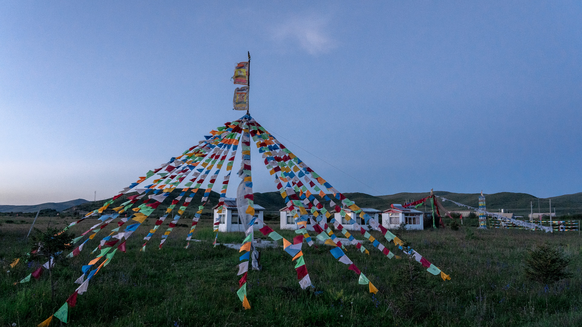 临近夜晚,天气突然边得越来越好,我们在若尔盖找了一处地势较高的地方下榻。我们的帐篷是上图左下角那两间