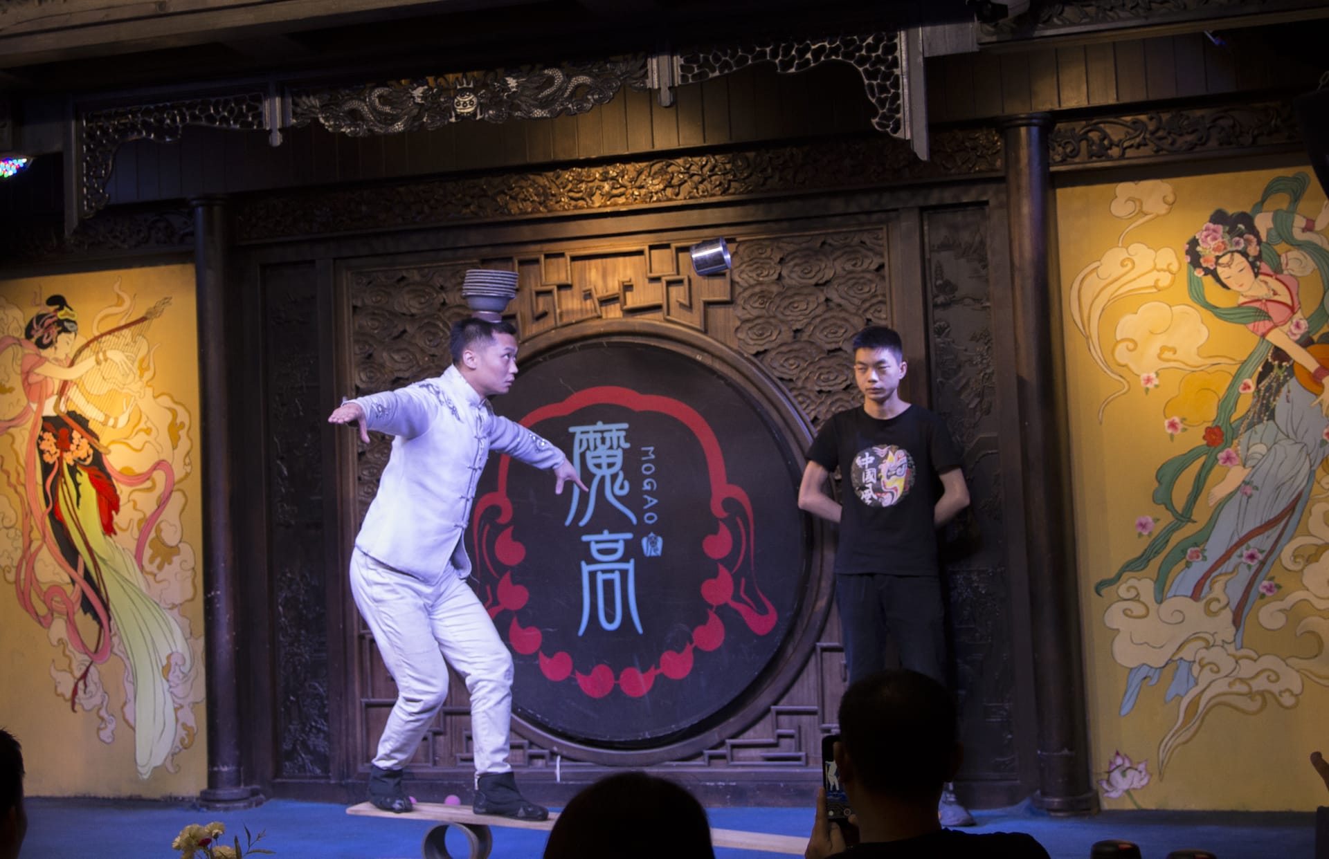 更令我惊愕的是,这家剧院表演的节目和我上次看的几乎没有区别,难道所有剧院表演的都是一样一样的么!?一般是古琴、长笛、快板、茶艺表演、杂技、川戏、皮筋滚灯、变脸、皮影、手舞、和卖字画。而且这家剧院弹琴的小姐姐远不如上回的好看,所以我相机都懒得举了,差评!下图是两年前拍的: