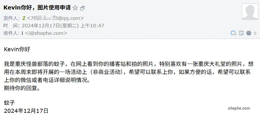 其实这篇文章躺在我草稿箱里也有段时间了。最初起意写它,是因为在 2024 年年底,我收到一封图片使用申请的邮件。那张图,是我在 2017 年拍摄并发在 Kevin’s 博客上的重庆人民大礼堂夜景。那时候我对拍摄、修图还一窍不通(当然,现在也没好多少),评论区的 @老何 还帮我调了个色。一转眼,时间过去这么多年了。