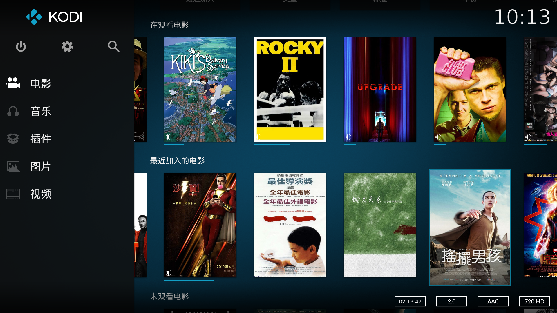 磁盘共享成功后,电视上的 Kodi 用 NFS 协议直接就能找到硬盘里面的硬盘/图片等等,看电影什么的非常方便。Kodi 是一款多平台家庭影院系统,功能强大且具有高度的可定制性:能安装皮肤定义想要的界面,也可以安装不同插件实现各种复杂的功能,这里就不展开了。