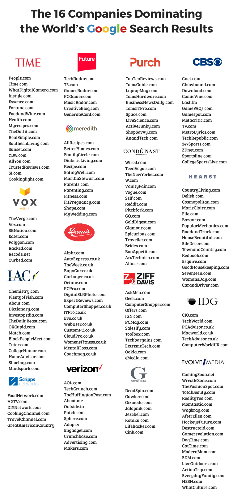 以下 16 家公司的网站群几乎垄断了 Google 搜索结果,如果你做过一段时间的英文 SEO,应该也注意过这些网站: