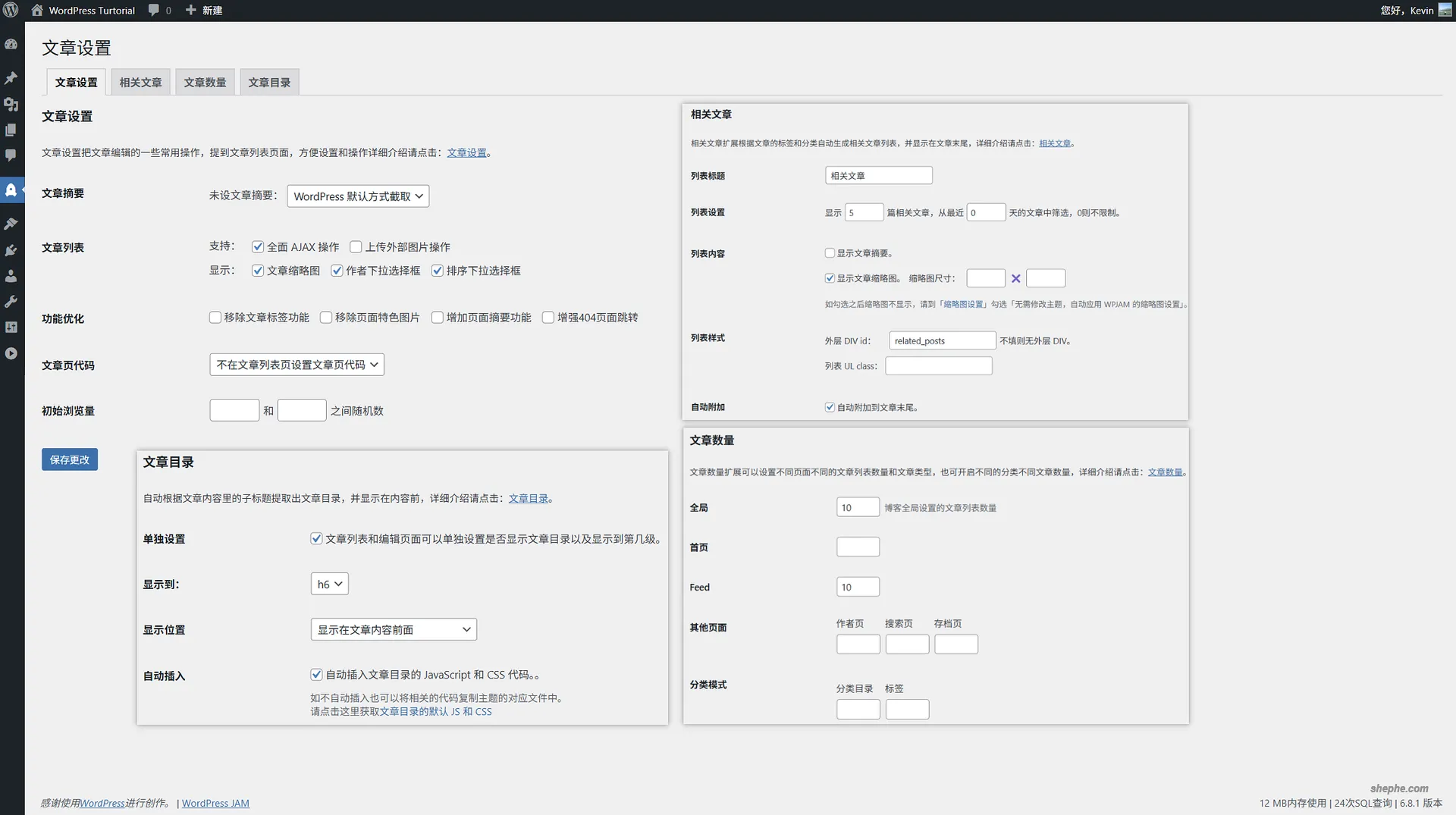 此外还新增了相关文章和文章目录两个功能,对于一些主题本身不具备这类内容增强的站点来说非常实用。相关文章功能可以根据标签、分类或关键词自动推荐与当前文章相关的内容,提升用户粘性和页面浏览量。